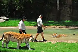 Tiger Island is a wildlife attraction at the Dreamworld amusement park on the Gold Coast, Queensland, Australia.[1] This exhibit houses both the Bengal and Sumatran tiger species and hosts interactive events with the tigers. The tigers have grown up within the compound and have established strong bonds with their trainers. These tigers are free to roam and interact with the visitors in the amusement park. [2]