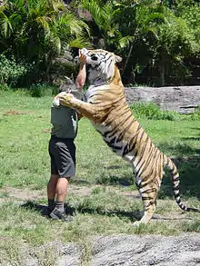 Tiger presentations are performed twice daily in the main exhibit. Guests can watch as the tigers perform feats which showcase their agility. During the presentation, the tigers climb 20-foot (6.1 m) trees and jump up to 10-foot (3.0 m) into the air.[30][31] In 2013, Cub College featured some of the younger tigers' performance.[32]