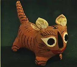 In Chinese folklore, the tiger has been considered the king of the animals since at least the Han-era Shuowen Jiezi,[16] with stripes over its forehead frequently redrawn to form the character for king (王).[4][17] In folk tales, tigers generally enact divine jugdment, killing evil men and protecting the good in accordance with the will of Heaven.[18] Some successfully contest the tigers, while other times resistance is useless, a tiger bring lovers together,[19] or one rewards kind or virtuous behavior.[20] In the official History of the Jin, the biography of the Taoist hermit Guo Wen (郭文, Guō Wén, fl. c. 322) quotes him as explaining how he was able to live unharmed in his mountain retreats with the words "If a person does not think of harming a beast, the beast does not harm them".[21] In one story, a father threatens a Taoist immortal so that he can wear his transformative tiger skin to visit home; using it to travel quickly in the form of a tiger, he eats his son while imagining him no different from a pig.[19] In another, a man condemned by Heaven to live as a tiger for eating a magic fish attempts to bring prey to his family to provide for them but, not recognizing him, they kill him.[22] One Taoist legend concerns two brothers who protect humanity by capturing demons and throwing them to tigers.