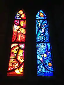 The brochure produced by the Diocese of Diocese suggests 'The painted stained glass windows are a gateway, a portal into the light, a way of entering into a mood of meditation. They seek to invoke a feeling of mystery, or present an enigma and a profound experience of light and shade and colour.'[21]