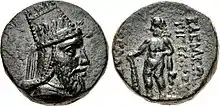 Little is known about his reign of Armenia although some coinage has survived from his reign.[17] The surviving coinage reflects his Hellenic and Armenian descent and provides evidence that he relinquished his Jewish connections.[18] His royal title is in Greek ΒΑΣΙΛΕΩΣ ΤΙΓΡΑΝΟΥ ΜΕΓΑΛΟΥ which means of great King Tigranes. In 12 AD, Erato and Tigranes were overthrown. Augustus kept Armenia as a client kingdom and appointed Vonones I of Parthia as King of Armenia.[19]