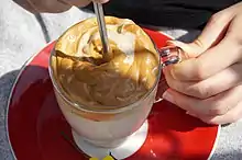 Dalgona coffee is whipped coffee that is made by combining equal parts of coffee, sugar, hot water, and then whipping the mixture to produce a froth-like texture.[11] Dalgona coffee originates from Macau, but first emerged as a trend in South Korea where it earned its name.[11] In March 2020, the trend emerged in the United States.[11][12]