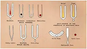 The choice of style is not mandated in Hindu texts, and it is left to the individual and the regional culture, leading to many versions. The known styles include[15] Vijayshree – white tilaka urdhwapundra with a white line in the middle,[15] founded by Swami Balanand of Jaipur; Bendi tilaka – white tilak urdhwapundra with a white round mark in the middle,[16] founded by Swami Ramprasad Acharya of Badasthan Ayodhya; and Chaturbhuji tilaka – white tilak urdhwapundra with the upper portion turned 90 degrees in the opposite direction, no shri in the middle, founded by Narayandasji of Bihar, ascetics of Swarg Dwar of Ayodhya follow it. Sharma has named additional styles as, Vallabh Sampraday Tilak, Sri Tilaka of Rewasa Gaddi, Ramacharandas Tilaka, Srijiwarama ka Tilaka, Sri Janakraja Kishori Sharan Rasik Aliji ka Tilaka, Sri Rupkalajee ka Tilaka, Rupsarasji ka Tilaka, Ramasakheeji ka Tilaka, Kamanendu Mani ka Tilaka, Karunasindhuji ka Tilaka, Swaminarayana Tilaka, Nimbarka ka Tilaka and Madhwa ka Tilaka.[17]