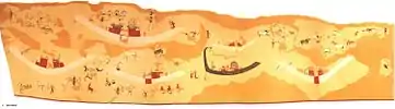 A not political, but social related mural covers a wall in an old building, once a prison, at the top of a cliff in Bardiyah, in Libya. It was painted and signed by the artist in April 1942, weeks before his death on the first day of the First Battle of El Alamein. Known as the Bardia Mural, it was created by English artist, private John Frederick Brill.[16]