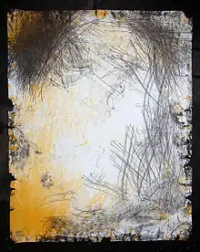 Hastie received Tillamook Cheddar as a 30th birthday gift from his mother, picking her out of a litter in Greenwich, Connecticut.[1] Hastie first noted what he thought were her artistic inclinations when she was six months of age; while he was sitting on his couch writing on a legal pad, she jumped up and began scratching at the pad. Believing that she was attempting to communicate in some way, he affixed a sheet of carbon paper to the pad and she scratched her first image.[2]
