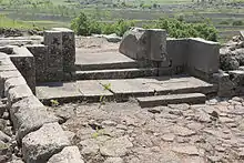 Two basalt gate lions were found next to the monumental gate on the east side of the city, which was the main entrance gate. There are two smaller gates, one in the northwest and the other in the southwest. Rectangular defence towers around the perimeter were also constructed, and there was a casemate fortification system.[10]