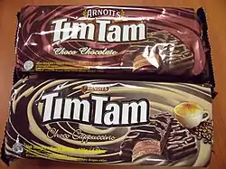 Tim Tam is a brand of chocolate biscuit introduced by the Australian biscuit company Arnott's in 1964. It consists of two malted biscuits separated by a light hard chocolate cream filling and coated in a thin layer of textured chocolate.[1]