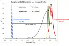 As noted in the table above, fluorescent energy transfer from Europium to allophycocyanin can be used in a time resolved manner, particularly in biomolecular screening assays. The figure at right shows the intersection of the emission from Europium with the excitation of allophycocyanin (APC) where energy transfer occurs when Europium and APC are brought into proximity via biomolecular interactions.