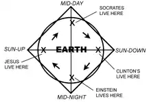 Ray's personal model of reality, called "Time Cube," states that all of modern physics and education is wrong,[2] and argues that, among many other things, Greenwich Time is a global conspiracy. He uses various graphs (along with pictures of himself) that purport to show how each day is really four separate days—SUN-UP, MID-DAY, SUN-DOWN, and MID-NIGHT (formerly morning, early afternoon, late afternoon, and evening)—occurring simultaneously.[1][3]