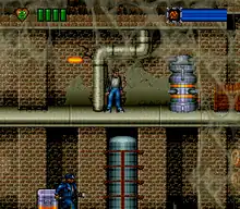 Time Trax is a side-scrolling action-platform game based on the television series of the same name, similar to Rolling Thunder (1986) and the Super Star Wars titles.[2][3][4][5] The plot follows police captain Darien Lambert of the Fugitive Retrieval Section, joined by the Specified Encapsulated Limitless Memory Archive (S.E.L.M.A.) supercomputer, traveling back in time using the Trax machine to capture commander Sepp Dietrich and apprehend crimial fugitives and doctor Mordecai Sahmbi, who has sent crimial fugitives back in time to assist him in his plan of changing history and gain control of the future.[3][4][6]