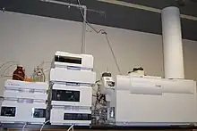 Hadamard transform time-of flight mass spectrometry (HT-TOFMS) is a mode of mass analysis used to significantly increase the signal-to-noise ratio of a conventional TOFMS.[14] Whereas traditional TOFMS analyzes one packet of ions at a time, waiting for the ions to reach the detector before introducing another ion packet, HT-TOFMS can simultaneously analyze several ion packets traveling in the flight tube.[15] The ions packets are encoded by rapidly modulating the transmission of the ion beam, so that lighter (and thus faster) ions from all initially-released packets of mass from a beam get ahead of heavier (and thus slower) ions.[16] This process creates an overlap of many time-of-flight distributions convoluted in form of signals. The Hadamard transform algorithm is then used to carry out the deconvolution process which helps to produce a faster mass spectral storage rate than traditional TOFMS and other comparable mass separation instruments.[14]