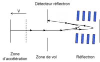 The kinetic energy distribution in the direction of ion flight can be corrected by using a reflectron.[7][8] The reflectron uses a constant electrostatic field to reflect the ion beam toward the detector. The more energetic ions penetrate deeper into the reflectron, and take a slightly longer path to the detector. Less energetic ions of the same mass-to-charge ratio penetrate a shorter distance into the reflectron and, correspondingly, take a shorter path to the detector. The flat surface of the ion detector (typically a microchannel plate, MCP) is placed at the plane where ions of same m/z but with different energies arrive at the same time counted with respect to the onset of the extraction pulse in the ion source. A point of simultaneous arrival of ions of the same mass-to-charge ratio but with different energies is often referred as time-of-flight focus. An additional advantage to the re-TOF arrangement is that twice the flight path is achieved in a given length of the TOF instrument.