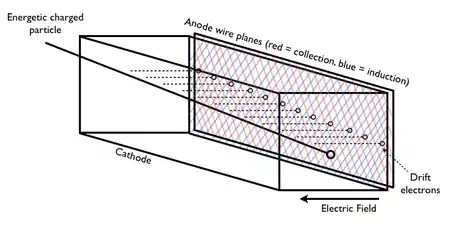 The body of a typical LArTPC is formed of three parts. On one side of the detector is a high-voltage cathode plane, used to establish a drift electric field across the TPC. Although the exact electric potential at which this is set is dependent on the detector geometry, this high-voltage cathode typically produces a drift field of 500 V/cm across the detector.[10]