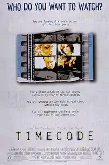 Timecode is a 2000 American experimental film written and directed by Mike Figgis and featuring a large ensemble cast, including Salma Hayek, Stellan Skarsgård, Jeanne Tripplehorn, Suzy Nakamura, Kyle MacLachlan, Saffron Burrows, Holly Hunter, Julian Sands, Xander Berkeley, Leslie Mann and Mía Maestro.[4]