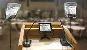 A teleprompter is a display device that prompts the person speaking with an electronic visual text of a speech or script. Using a teleprompter is similar to the practice of using cue cards. The screen is in front of and usually below the lens of the camera, and the words on the screen are reflected to the eyes of the performer using a sheet of clear glass or specially prepared beam splitter. The teleprompter was invented in 1950 by Hubert Schlafly, who was working at 20th Century Fox film studios in Los Angeles.[56]