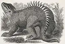 The first scientifically documented ankylosaur remains were recovered from Early Cretaceous rocks in England and named Hylaeosaurus armatus by Gideon Mantell in 1833.[4] However, the Ankylosauria itself would not be named until Henry Fairfield Osborn did so in 1923 nearly a hundred years later.[5] Prior to this, the ankylosaurs had been considered members of the Stegosauria, which included all armored dinosaurs when Othniel Charles Marsh named the group in 1877. It was not until 1927 that Alfred Sherwood Romer implemented the modern use of the name Stegosauria as specifically pertaining to the plate-backed and spike-tailed dinosaurs of the Jurassic that form the ankylosaurs' nearest relatives.[6] The next major revision to ankylosaur taxonomy would not come until Walter Coombs divided the group into the two main families paleontologists still recognize today; the nodosaurids and ankylosaurids.[5] Since then, many new ankylosaur genera and species have been discovered from all over the world and continue to come to light. Many fossil ankylosaur trackways have also been recognized.[7]