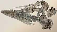 Other notable late 20th century advances in ichthyosaur research include the recognition of a new genus of ichthyosaur called Eurhinosaurus longirostris that had been misclassified as a species of Ichthyosaurus since 1854.[9] In 1986 Christopher McGowan would describe another, similar animal serendipitously discovered in England as Excalibosaurus, after King Arthur's mythical sword.[9] The late 1990s and early 21st century would see scholarly debate regarding the cause of the ichthyosaurs' extinction, especially regarding the potential role played by competition with the mosasaurs which had evolved around the time.[10]
