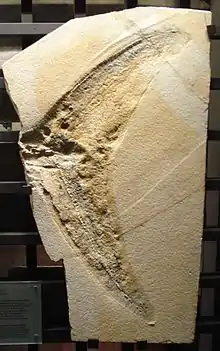 Early researchers recognized ichthyosaurs as marine reptiles, but major aspects of their anatomy and behavior needed to be resolved. They were frequently portrayed as leaving the water to bask on rocks and with straight tails.[4] Although a bend in ichthyosaurs' tail vertebrae was seen from the earliest specimens, scholars assumed the bend reflected damage incurred to the animal's carcass after death. This bend was so common, however, that scholars eventually realized that it was natural and supported a shark-like tail fin.[5] Scientists came to realize that ichthyosaurs were too adapted to leave the water even to lay eggs. Evidence for live birth in ichthyosaurs dates back as far as 1846, when Chaning Pierce reported an apparent fossil Ichthyosaurus embryo to Sir Richard Owen.[6]