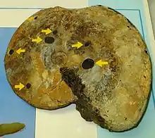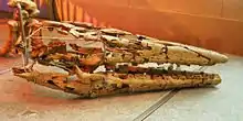 The 20th century soon saw the discovery in Alabama of a strange mosasaur called Globidens, with rounded teeth suited to crushing shells.[9] Mosasaur remains were also discovered in Africa and California.[10] In 1967 Dale Russell published a scientific monograph dedicated to mosasaurs.[11] Embryonic remains in the 1990s confirmed that mosasaurs gave live birth like in ichthyosaurs.[12] The 1990s also saw a revival and escalation of a debate regarding whether or not some supposed mosasaur toothmarks in ammonoid shells were actually made by limpets.[13] By the end of the century, the evolutionary relationship between mosasaurs and snakes as well as the possible involvement of mosasaurs in the extinction of the aforementioned ichthyosaurs became hot button controversies.[14]