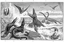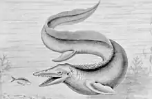 Williston also discussed mosasaur life appearance and behavior. He compared mosasaur scales to those of monitor lizards and misinterpreted some fossilized cartilage as evidence for a fringe of soft tissue down mosasaurs' backs.[50] He hypothesized that mosasaurs left the safety of the water to lay eggs on land.[51] The paleobiology of individual mosasaur taxa also received Williston's attention. He thought the genus Clidastes as an inhabitant of near-surface waters.[52] In contrast, Williston interpreted Platecarpus as a "deep diver" and thought Tylosaurus fed primarily on other marine reptiles.[53]
