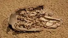 Fossilized Citipati egg with preserved embryo - Dong and Currie reported the discovery of an oviraptorid from the Djadokhta Formation of northern China preserved on top of a nest of eggs. This overturned more than 60 years of interpreting the Oviraptor of the Central Asiatic Expeditions as a rapacious egg-thief in favor of it likely being a faithful mother at her nest. The researchers reconstructed the way mother oviraptorosaurs built their nests. The standing mother would lay a pair of eggs and bury them by hand. Then she would turn and repeat the process until she had made a ring of egg-pairs completely around herself. Since by then the area where she was standing would be higher than the eggs, she would repeat the process with another ring of egg-pairs as a second layer. This process would gradually build an egg mound containing as many as 30 eggs in up to three layers.[3]