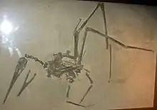 Although Cuvier's interpretation later became the consensus, it was just one of many early interpretations of the creature and its relatives, including that they were bats, strange birds, or the primordial handiwork of Satan himself.[4] Similar animals like the long-tailed Rhamphorhynchus and Gnathosaurus were soon discovered around Europe and it became obvious that earth was once home to a diverse group of flying reptiles.[5] The British anatomist Sir Richard Owen dubbed this vanished order the Pterosauria. Soon after, he described Britain's own first pterosaur, Dimorphodon.[6] Later in the 19th century pterosaurs were discovered in North America as well, the first of which was a spectacular animal named Pteranodon by paleontologist Othniel Charles Marsh.[7]