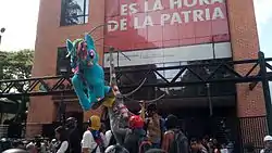 - 5 May - Opposition officials drape a large banner down the side of the National Assembly's administrative building high above central Caracas reading "Dictator Maduro".[95] Citizens of La Villa del Rosario burn and tear down a statue of late President Hugo Chávez, an image compared to the destruction of Saddam Hussein's statue in Iraq as well as other instances of statue toppling during times of popular unrest.[96][97]