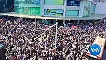 On 2 February 2021, some Yangonites staged a brief 15-minute protest rally at 20:00 local time, calling for the overthrow of the dictatorship and Suu Kyi's release.[6] On 4 February 2021, thirty citizens protested against the coup d'état, in front of the University of Medicine in Mandalay, an act that led to four arrests.[7][8]
