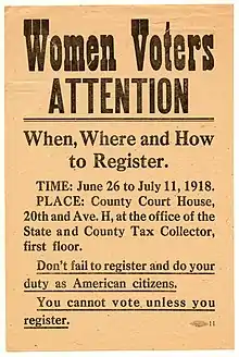 - Eleanor Brackenridge became the first woman to register to vote in Bexar County.[21] Hortense Sparks Ward was the first woman to register in Harris County.[39]