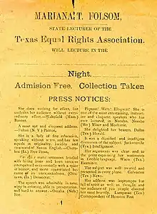 - Mariana Thompson Folsom conducts a more than ten week tour of Texas, giving women's suffrage lectures in various cities.[6]
