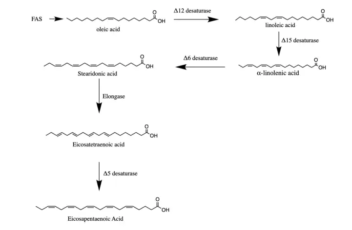 Here is an overview of the possible biosynthesis pathways of EPA from fatty acid synthesis (FAS). The reactions are mediated by desaturases enzymes with Δx specificity and elongated by elongases of fatty acid chains.