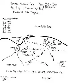In October 2003, Treadwell and his girlfriend, physician assistant Amie Huguenard (born October 23, 1965, in Buffalo, New York), visited Katmai National Park, which is on the Alaska Peninsula across Shelikof Strait from Kodiak Island. In Grizzly Man, Werner Herzog states that according to Treadwell's diaries, Huguenard feared bears and felt very uncomfortable in their presence. Her final journal entries indicated that she wanted to be away from Katmai.[13] Treadwell set his campsite near a salmon stream where wild bears commonly feed in autumn. Treadwell was in the park later in the year than normal,[3] at a time when bears attempt to gain as much fat as possible before winter. Food was scarce that autumn, causing the bears to be even more aggressive than usual.[1][14]