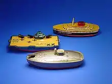 Tinplate was used in the manufacture of toys beginning in the mid-19th century. The invention of sheet metal stamping machines in 1815 allowed for the mass production of inexpensive toys. Tin toys were made from thin sheets of steel plated with tin, hence the name tinplate.[2] Tin toys were a cheap and durable substitute for wooden toys. The toys were originally assembled and painted by hand. Spring activated tin toys originated in Germany in the 1850s.[3] In the late 1880s offset lithography was used to print designs on tinplate. After the colorful designs were printed on the metal, they were formed by dies and assembled with small tabs. The lightweight nature of the toys allowed them to be shipped less expensively and easier than the heavier cast iron toys.