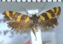 Fore wings narrow, deep yellow, base, two oblique fasciae, a costal spot, and hind marginal streak dark purple-fuscous ; hind wings dark fuscous.[3]