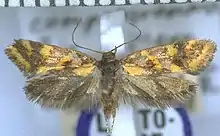 โ. 13-15 mm. Head, thorax, and abdomen dark purplish-fuscous. Antennal ciliations 1. Palpi grey, second joint sometimes partially suffused with whitish-yellowish. Forewings elongate, costa gently arched, apex obtuse, termen obliquely rounded ; dark violet-fuscous ; markings ochreous-yellow suffused in disc with fulvous-orange, and with some scattered blackish scales on their edges ; an oval blotch extending over basal fourth of dorsum ; a narrow irregular rather oblique fascia from costa before 1โ3, not reaching dorsum ; a transverse fasciate blotch from costa beyond middle, and another inwardly oblique from costa at 4โ5, both directed towards but not reaching a spot on dorsum before tornus ; a streak along termen throughout : cilia fuscous, base scaled with ochreous-yellow along terminal streak. Hindwings and cilia dark grey.[3]