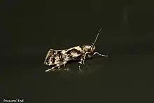 ♂. 11 mm. Head and thorax pale brown. Palpi, 2nd segment brown with apex whitish, terminal segment fuscous, with apex whitish ochreous. Antennae ochreous annulated with fuscous, ciliations in ♂ 1. Abdomen purplish grey. Legs ochreous mixed with fuscous, all tarsi banded with fuscous. Forewings with costa hardly arched, apex broadly rounded, termen rounded, oblique; white, densely irrorated with pale fuscous except beneath fold; markings consisting of obscure brown fascia and pale yellow spots; a rather large yellow patch on dorsum at base; a brown stripe along fold connecting with a slightly outwards-curved fascia from costa at 1⁄4 ; a rather prominent yellow spot at junction of these two fasciae and some yellow scales mixed with fascia from costa; a brown fascia from costa at 1⁄2 to tornus enclosing a yellow spot in disc and with some yellow scales at tornus; an obscure brown subterminal fascia containing some yellow scales: fringes brown with some white and yellow scales. Hindwings and fringes fuscous grey.[3]
