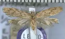 Male. — 16-16+1⁄2 mm. Head, palpi, antennae, and thorax ochreous-whitish, mixed with fuscous-grey. Abdomen ochreous-whitish. Anterior and middle legs fuscous-grey, central ring of tibiae and apex of all joints ochreous-whitish ; posterior legs ochreous-whitish. Forewings moderate, costa moderately arched, apex rounded, hindmargin extremely obliquely rounded ; pale whitish-grey, slightly ochreous-tinged, and irrorated with dark fuscous ; a cloudy fuscous spot on costa at base, another at 1⁄4, and a third in middle ; a small cloudy dark fuscous spot in disc near base ; a dark fuscous dot in disc before middle, a second beyond middle, and a third rather obliquely before first on fold ; a cloudy fuscous outwards-bent transverse line from f of costa to anal angle, indented inwards beneath costa : cilia pale whitish-ochreous, sprinkled with dark fuscous. Hindwings light grey, apex darker ; cilia grey-whitish, with a distinct grey line near base.[4]