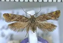 This species was first described by Edward Meyrick in 1916 using a specimen collected in Wellington in November by George Hudson and named Borkhausenia xanthomicta.[3] George Hudson discussed and illustrated this species under the name B. xanthomicta in his 1928 publication The butterflies and moths of New Zealand.[4] Philpott discussed this species under the name B. xanthomicta and studied the male genitalia of this species.[5] In 1988 J. S. Dugdale placed this species within the genus Tingena.[2] Dugdale noted that the male paralectotype from Wellington has genitalia very similar to that of the male T. affinis as illustrated by Philpott in 1926.[5][2] Dugdale goes on to state that the male paralectotype genitalia agrees with the illustrations of that species figured by Philpott in 1926.[5][2] The female lectotype, collected in Wellington, is held in at the Natural History Museum, London.[2]