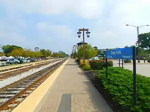 Tinley Park is a commuter railroad station along Metra's Rock Island District line in Tinley Park, Illinois. The station is officially located at 6700 South Street between Oak Park Avenue and 66th Court, however parking is also available on the opposite side of the station along North Street between Oak Park Avenue and 67th Avenue, as well as the center of the block of Oak Park Avenue, 173rd Street, 67th Court and 172nd Street. A gravel lot on South Street, across from the station entrance, is used as temporary commuter parking for approximately 100 vehicles. A large transit-oriented development (TOD) is slated to replace the temporary parking spaces in early 2019. The station itself lies 23.5 miles (37.8 km) away from LaSalle Street Station, the northern terminus of the line.[2] As of 2018, Tinley Park is the 57th busiest of Metra's 236 non-downtown stations, with an average of 917 weekday boardings.[1]
