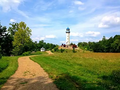 The Sherman Memorial Lighthouse, located on a 22.5-acre island in the Allegheny River, about 60 miles southeast of Erie. It opened in time to help the Forest County community of Tionesta celebrate its 150th birthday. The 75-foot-tall lighthouse is on a 25-foot-high mound of soil on what used to be called Hunters Island, and has now been renamed Lighthouse Island.