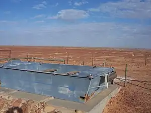 Bethesda Mission was established by German Lutherans at nearby Lake Killalpaninna around the same period and, after also being abandoned for a short time, was re-established and by the 1880s it resembled a small town with more than 20 dwellings including a church. At this time, it had a population of "several hundred aborigines and a dozen whites".[18] Primarily financed by sheep grazing, the mission closed in 1917 due to the effects of drought and rabbit plagues. Currently, there is little evidence of the settlement other than a small cemetery and some remnant timber posts.[18] The mission remains are listed on the South Australian Heritage Register as the Killalpaninna Mission Site.[20]