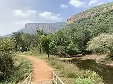 Silathoranam, a natural arch and a distinctive geological feature, is located in the Tirumala Hills at a distance of 1 km (0.62 mi) from Tirumala Venkateshvara Temple. The Arch measures 8 metres in width and 3 metres in height and is eroded from quartzite of Cuddapah Supergroup of Middle to Upper Proterozoic (1600 to 570 Ma) by weathering agents like water and wind.[26]