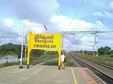The Tirusulam Railway Station is one of the railway stations of the Chennai Beach–Chengalpattu section of the Chennai Suburban Railway Network. It serves the neighbourhood of Tirusulam, a suburb of Chennai where the city's airport is located. It is located at a distance of 21 km (13 mi) from Chennai Beach terminus and is situated on the GST Road across the airport, with an elevation of 20 m (66 ft) above sea level.