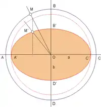 In the adjacent image, ABCD is a circle with unit area defined in a spherical or ellipsoidal model of the Earth, and A′B′C′D′ is the Tissot's indicatrix that results from its projection onto the plane. Segment OA is transformed in OA′, and segment OB is transformed into OB′. Linear scale is not conserved along these two directions, since OA′ is not equal to OA and OB′ is not equal to OB. Angle MOA, in the unit area circle, is transformed in angle M′OA′ in the distortion ellipse. Because M′OA′ ≠ MOA, we know that there is an angular distortion. The area of circle ABCD is, by definition, equal to 1. Because the area of ellipse A′B′ is less than 1, a distortion of area has occurred.
