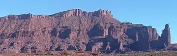The Fisher Towers viewed from the west. In the right half of the picture the three fins of rock that make up the Fisher Towers are visible from left (north) to right (south) ending with Titan tower