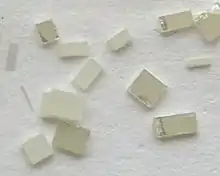 TiO2 is also an effective opacifier in powder form, where it is employed as a pigment to provide whiteness and opacity to products such as paints, coatings, plastics, papers, inks, foods, supplements, medicines (i.e. pills and tablets), and most toothpastes; in 2019 it was present in two-thirds of toothpastes on the French market.[38] In food, it is commonly found in products like ice creams, chocolates, all types of candy, creamers, desserts, marshmallows, chewing gum, pastries, spreads, dressings, cakes, and many other foods.[39] In paint, it is often referred to offhandedly as "brilliant white", "the perfect white", "the whitest white", or other similar terms. Opacity is improved by optimal sizing of the titanium dioxide particles.