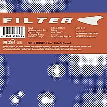 Title of Record is the second studio album by American rock band Filter, released on August 24, 1999, by Reprise Records. The album's earlier sessions were marred with slow progress due to lineup changes and frontman Richard Patrick's decision to construct his own studio for recording. However, progress improved after solidifying the lineup and bringing in further production help. In support of the album's release, Filter performed on the 1999 Family Values Tour.