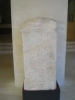 Two inscriptions, one from Rome,[4] the other from Leon,[5] provides us the details of his cursus honorum. Pollio's career began in his teens as one of the tresviri monetalis, the most prestigious of the four boards that comprise the vigintiviri; assignment to this board was usually allocated to patricians or favored individuals.[6] His next office was as a quaestor, and upon completion of this traditional Republican magistracy Pollio would be enrolled in the Senate. As a patrician, Pollio was ineligible to hold the office of plebeian tribune, and was excused from serving as an aedile, so his next office was the traditional Republican magistracy of praetor. At this point, he acceded to the suffect consulship almost automatically after reaching his thirty-second or thirty-third birthday. By this point in his life Pollio had been admitted to the sodales Antoniniani.