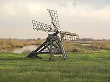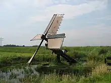 The paaltjasker was built in 1975 for Staatsbosbeheer to pump water into nature reserve De Zandpoel near Wijckel.[30] The windshaft has an extra support bearing just above the Archimedes' screw.[31] The mill is located near a small rest stop on the N359 road between Lemmer and Sondel.