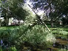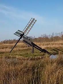 The paaltjasker was built in 1973 by R.W. Dijksma as the fifth in a 'new' series of post-war tjaskers[23] and placed in nature reserve De Deelen, east of Tijnje. The mill is owned by Staatsbosbeheer and can be used to pump water into the nature reserve. The four symmetrical Common sails have a span of 5.28 metres (17 ft 4 in) and are covered by wooden slats instead of sail cloth.[24][25]
